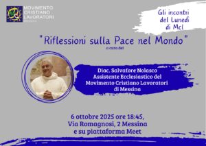 Alla Pace “disarmata e disarmate” il Santo Padre ha dedicato ampio spazio sin dai primi istanti del suo Pontificato ; le guerre, i conflitti accesi in tutto il mondo sono il principale fattore di rischio per il futuro e la più profonda ferita per il presente. Abbiamo deciso di dedicare il primo degli incontri tematici di questo anno sociale proprio alla Pace, affidando la riflessione al nostro Assistente, Salvatore Nolasco. Vi aspettiamo lunedì alle 18.45 in via Romagnosi due e per chi non potesse raggiungere la sede sarà garantito il collegamento al link http://meet.google.com/svq-mybb-igm