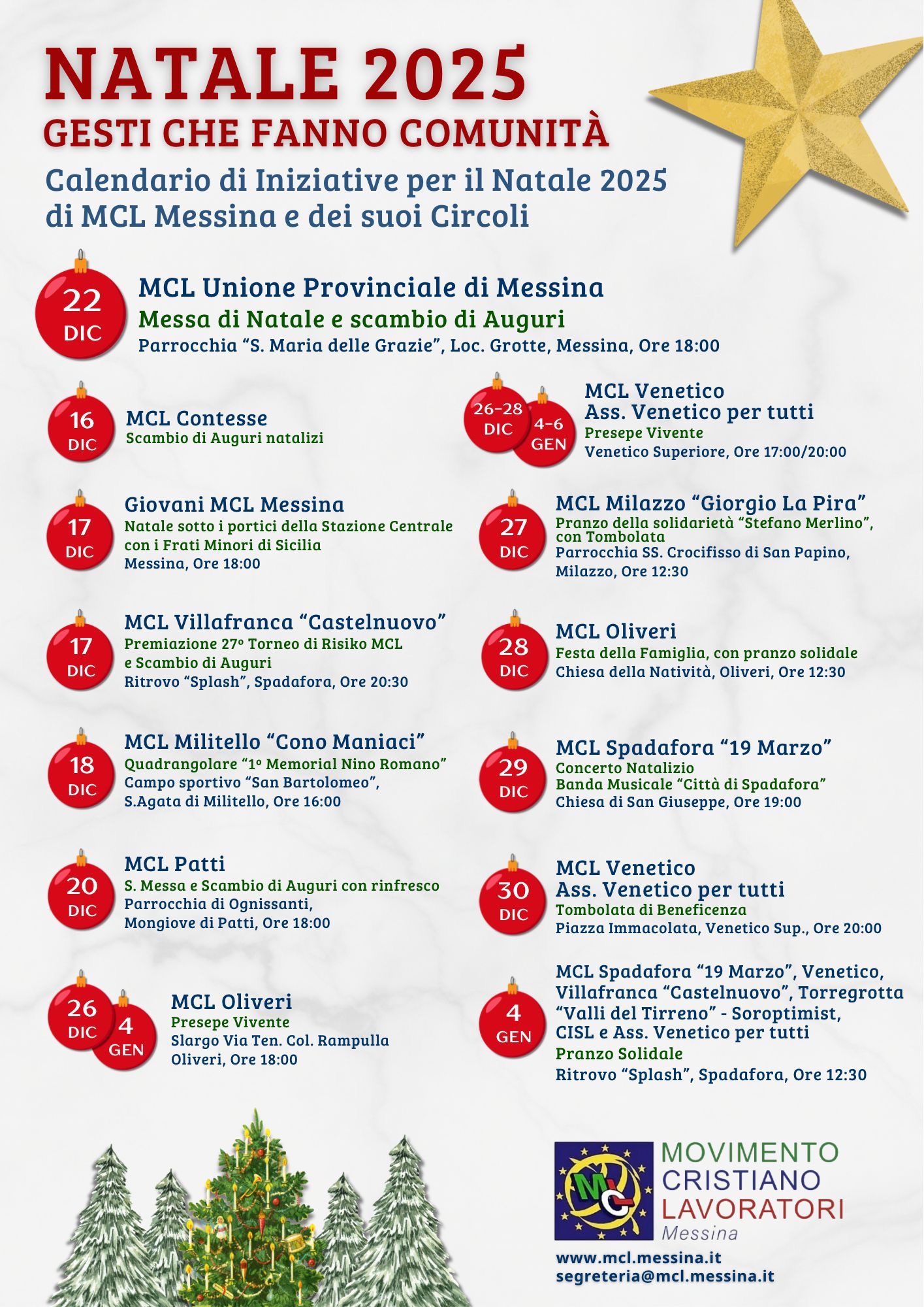 Torna il Natale in Comunità di MCL Messina, 13 appuntamenti in città e in provincia per fare comunità, per valorizzare i territori e le tradizioni dei piccoli centri, per sostenere anche i più fragili in questo periodo di festa e riflessione.